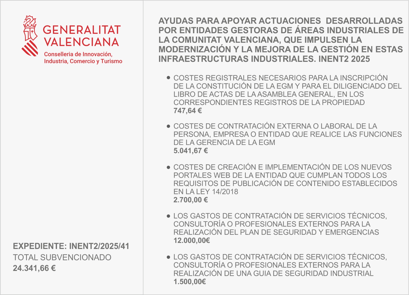 El Ayuntamiento de Alicante, a través de Impulsalicante, la Agencia Local de Desarrollo Económico y Social, ha conseguido para este 2025-26 ayudas del Ivace por importe de 2.152.706 euros para financiar actuaciones con carácter bianual de mejora e innovación de las cinco principales áreas industriales y enclaves tecnológicos de la ciudad como son: Las Atalayas, Pla de la Vallonga, Aguamarga, Llano del Espartal (Ocaña Avanza), Zona de Influencia de Mercalicante. Estas subvenciones alcanzan el 89% de las cantidades solicitadas por importe de 2.424.280,64 euros.